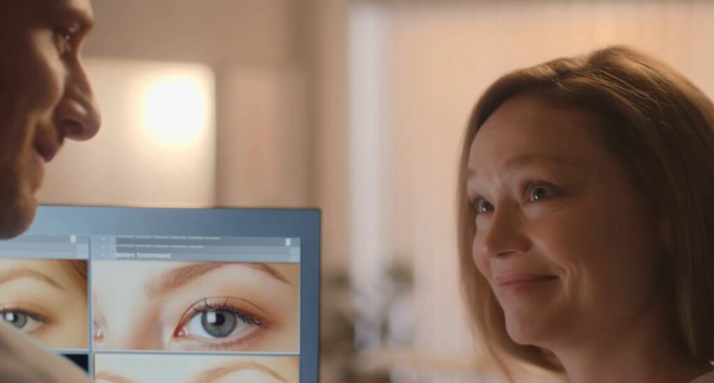 Kijkt de arts met u mee via de camera om de mate van huidoverschot, eventuele ptosis (spierzwakte) of asymmetrie van de oogleden te beoordelen.